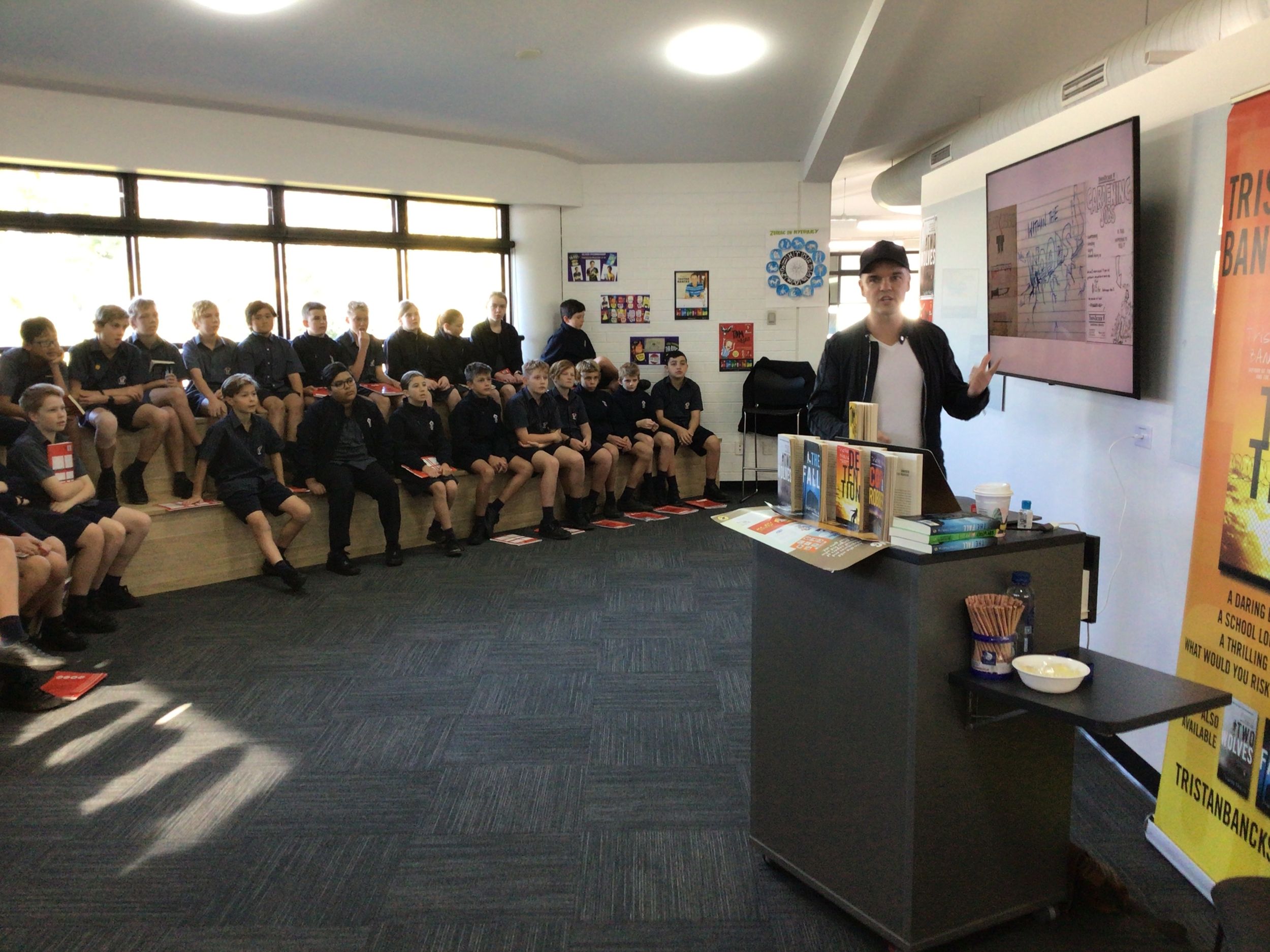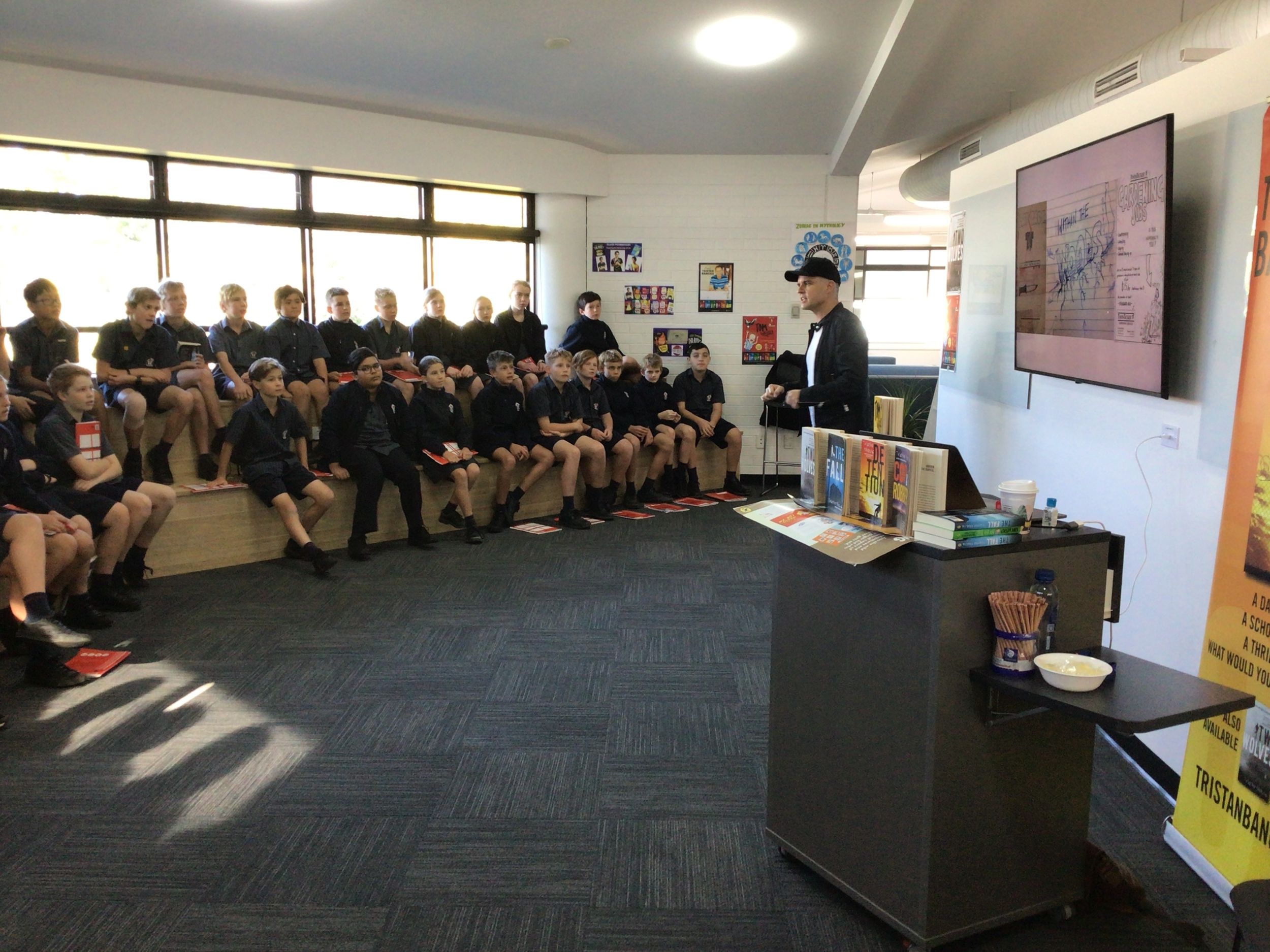Tristan Bancks tells stories for the page and screen. His books for kids and teens include Two Wolves, The Fall, Detention, the Tom Weekly series, and Nit Boy. As part of their Talk4Write units of works, Stage 3 have been using a range of Tristan’s books for inspiration as they include magnificent stories of adventure, companionship, deceit and mystery. Tristan spent the whole day with Stage 3 classes and treated them to a writer’s workshop as well as discussion about how his ideas for his books came about and some of the interesting techniques he uses to inspire his writing.