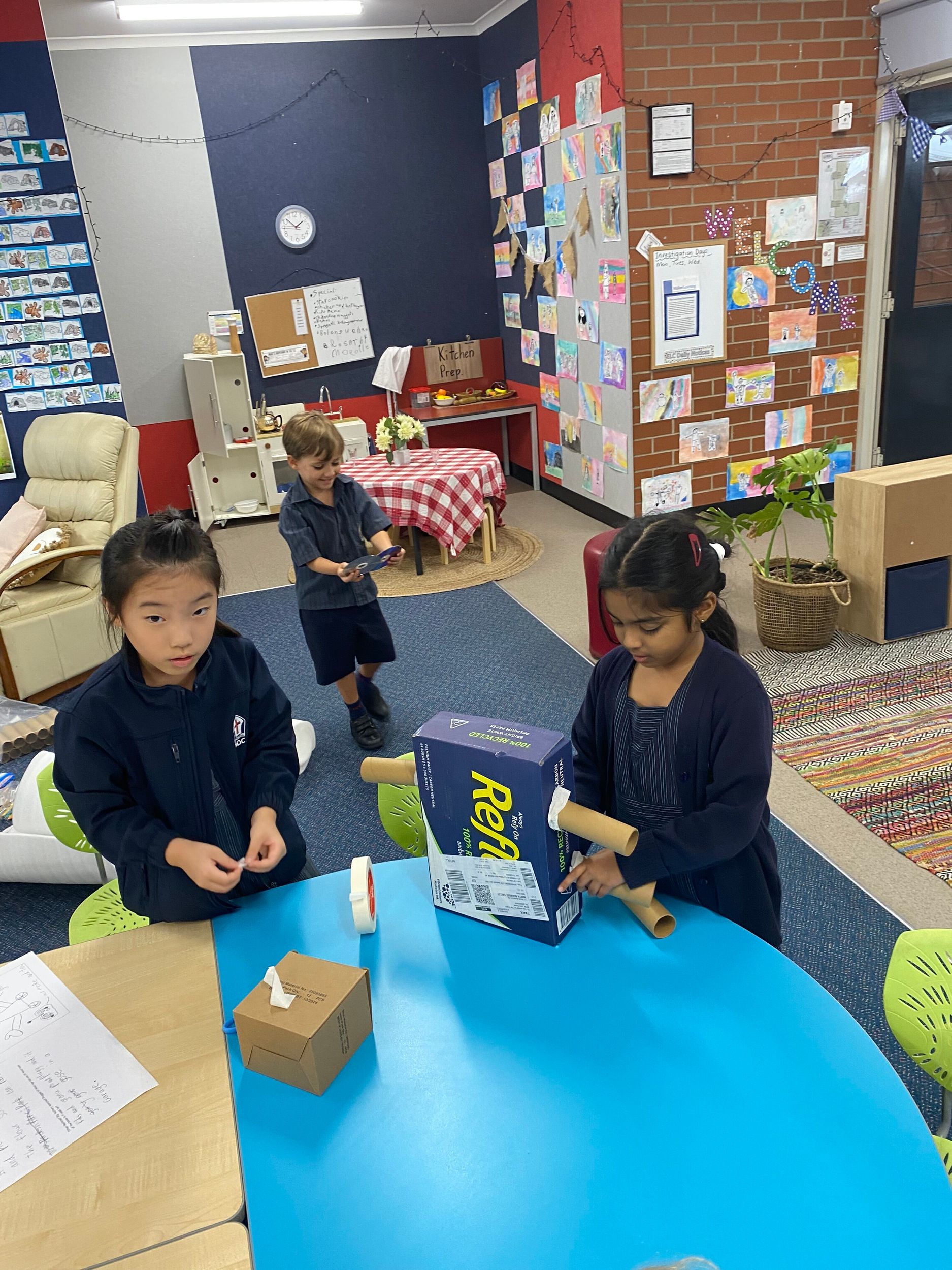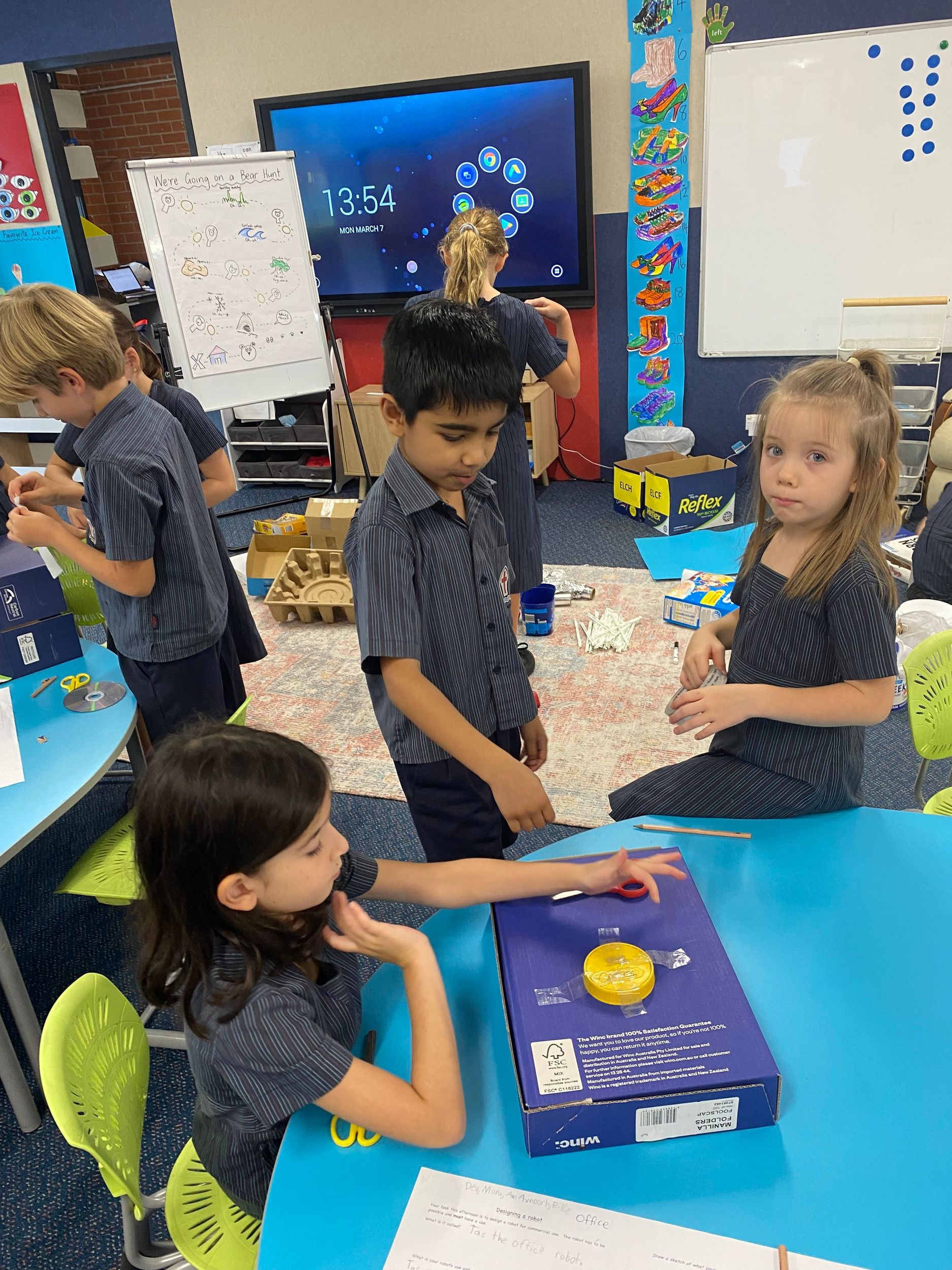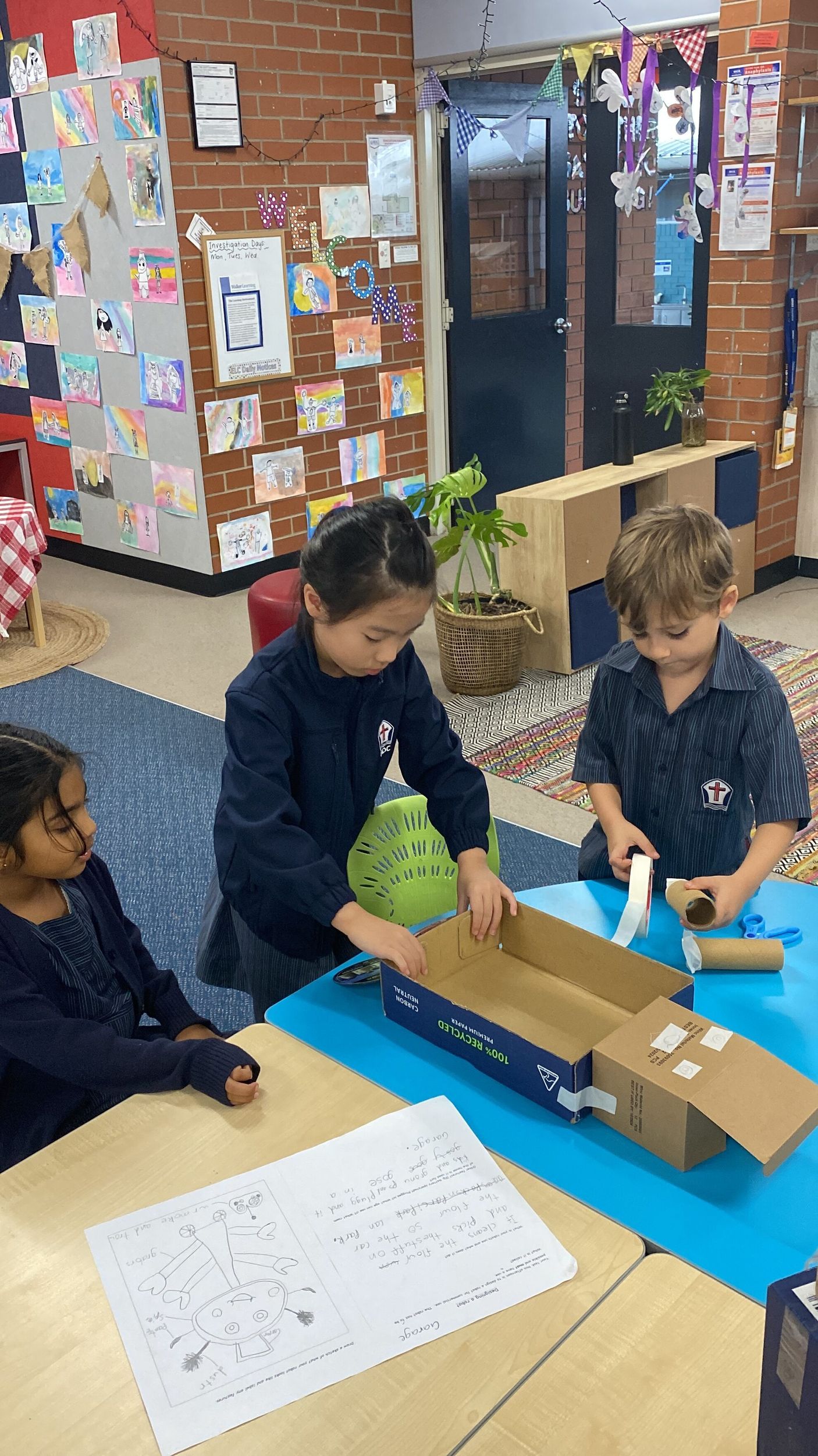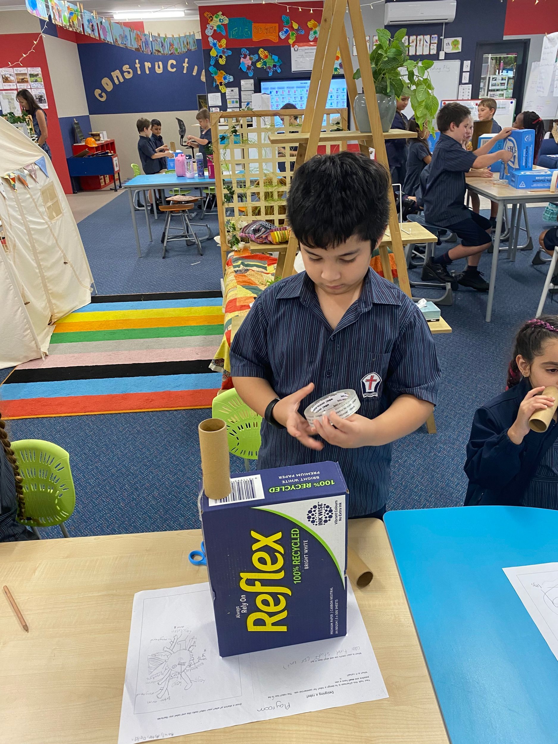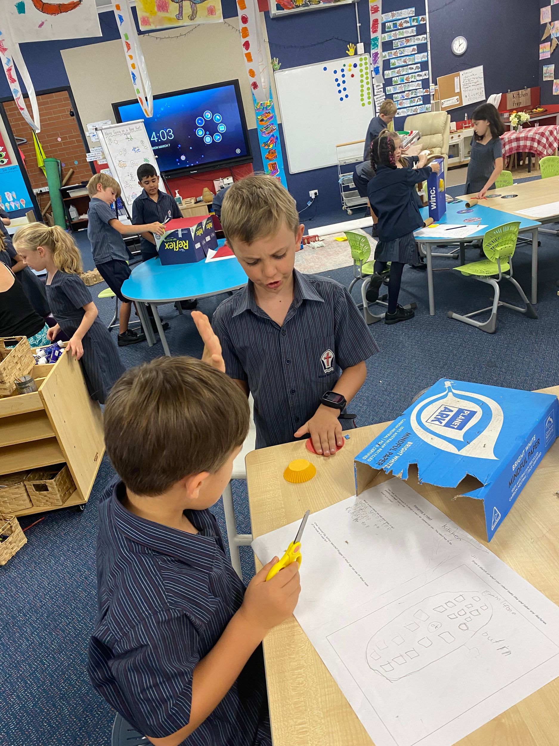 This term in the ELC we have been learning about change and innovation in Science lessons. We have worked in our buddy groups to design and make a robot to assist in different rooms of our houses. We had to work cooperatively and compromise whilst we were working on this project. We modified our design to improve it and also during the construction stage. It was a valuable and enjoyable experience for us all.