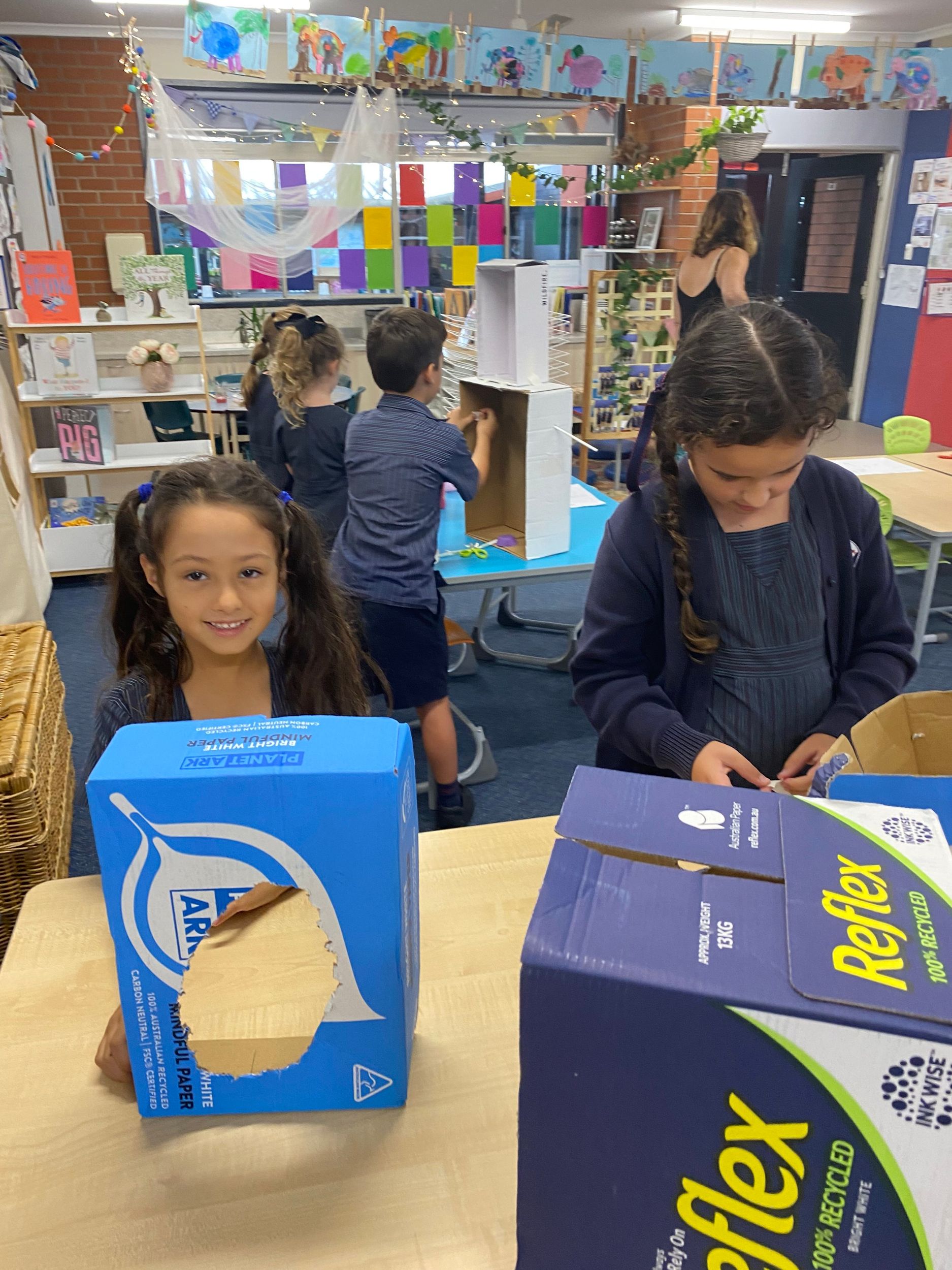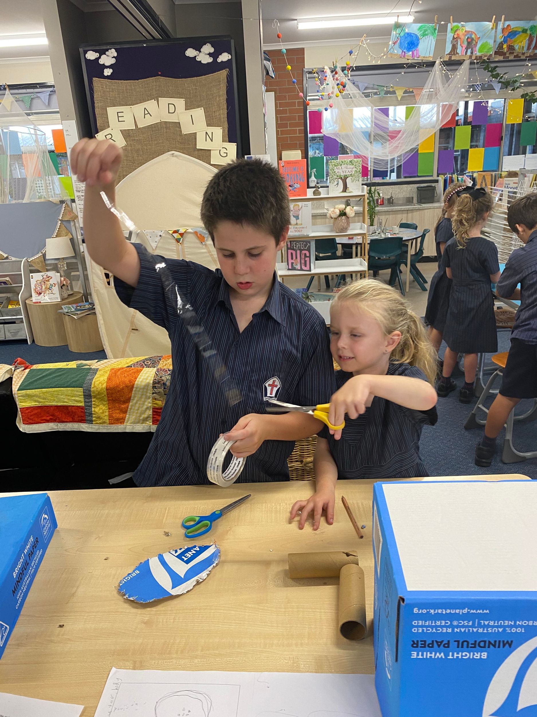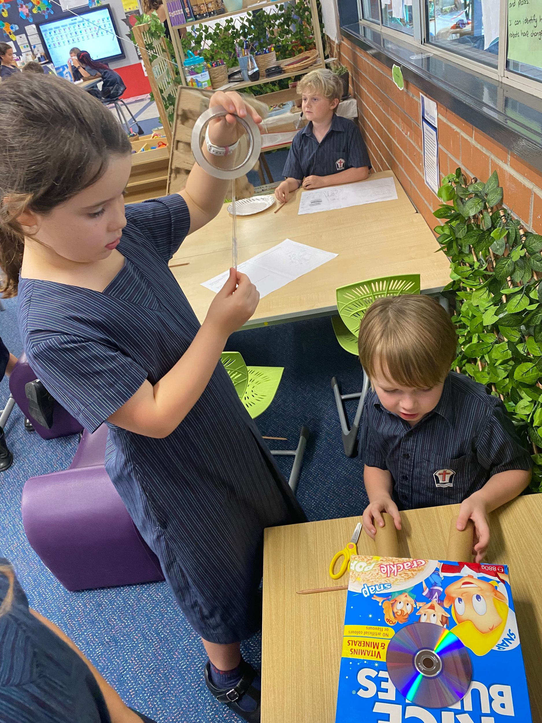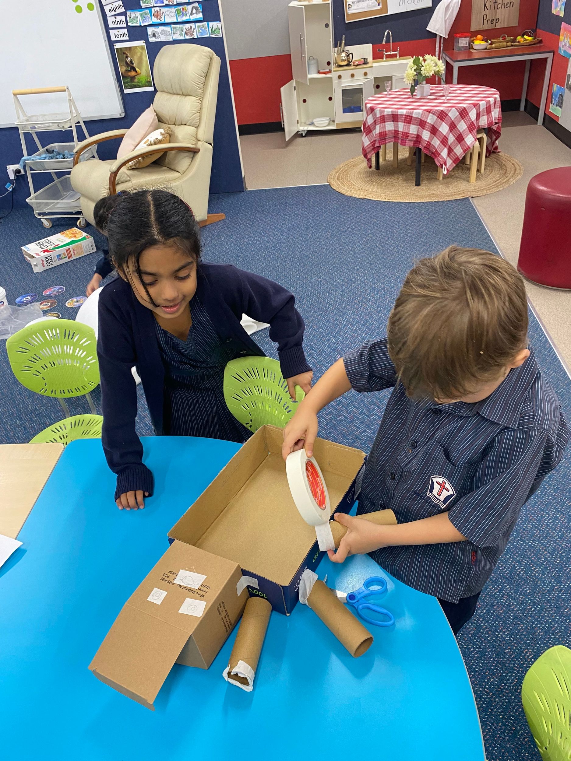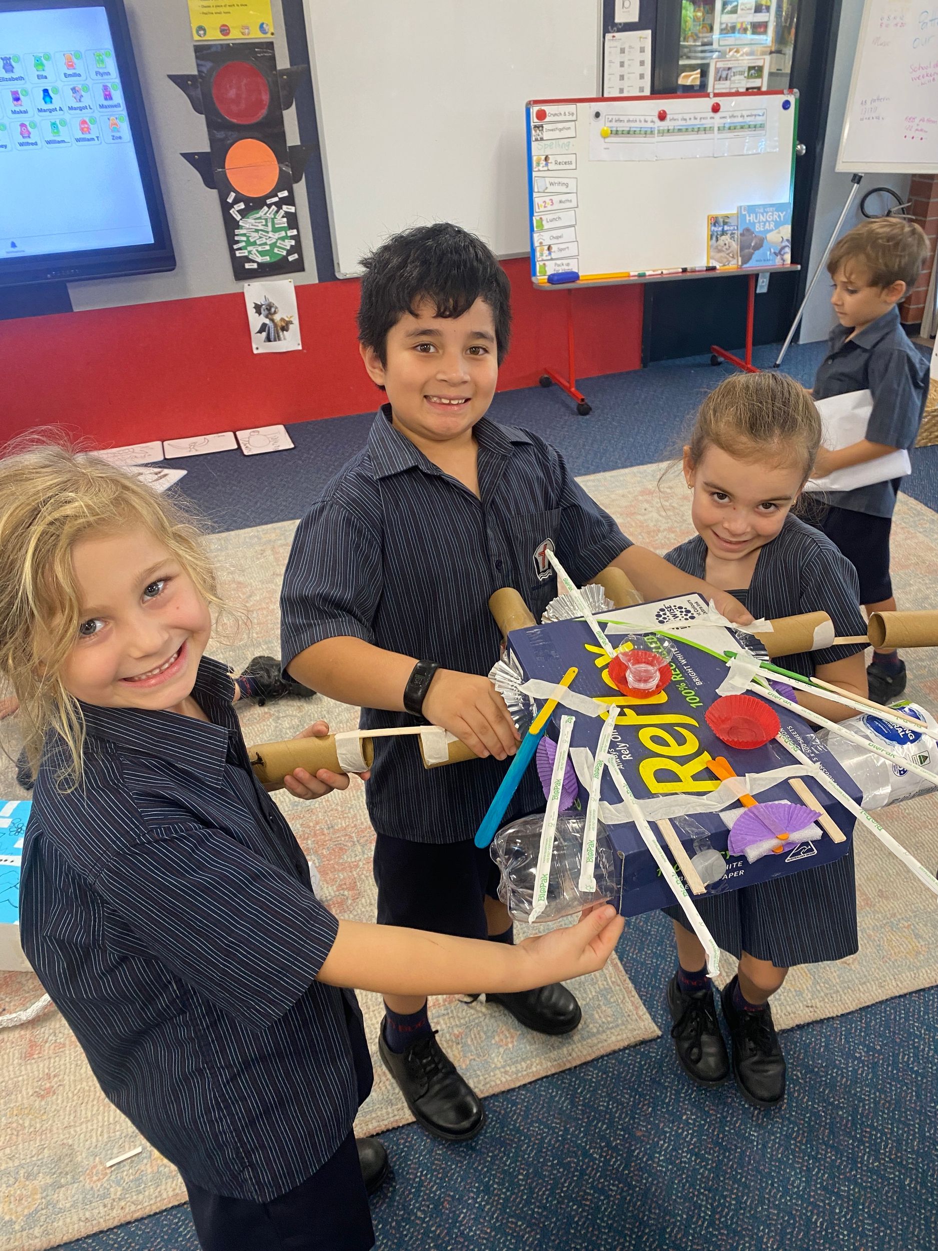 This term in the ELC we have been learning about change and innovation in Science lessons. We have worked in our buddy groups to design and make a robot to assist in different rooms of our houses. We had to work cooperatively and compromise whilst we were working on this project. We modified our design to improve it and also during the construction stage. It was a valuable and enjoyable experience for us all.