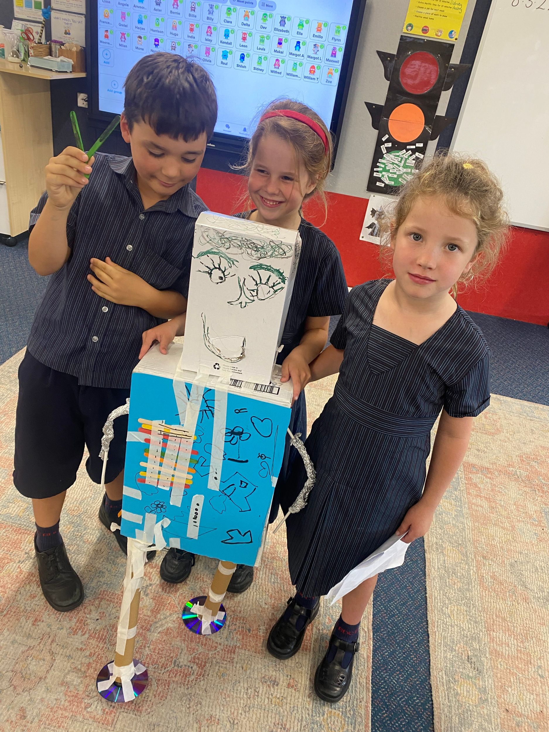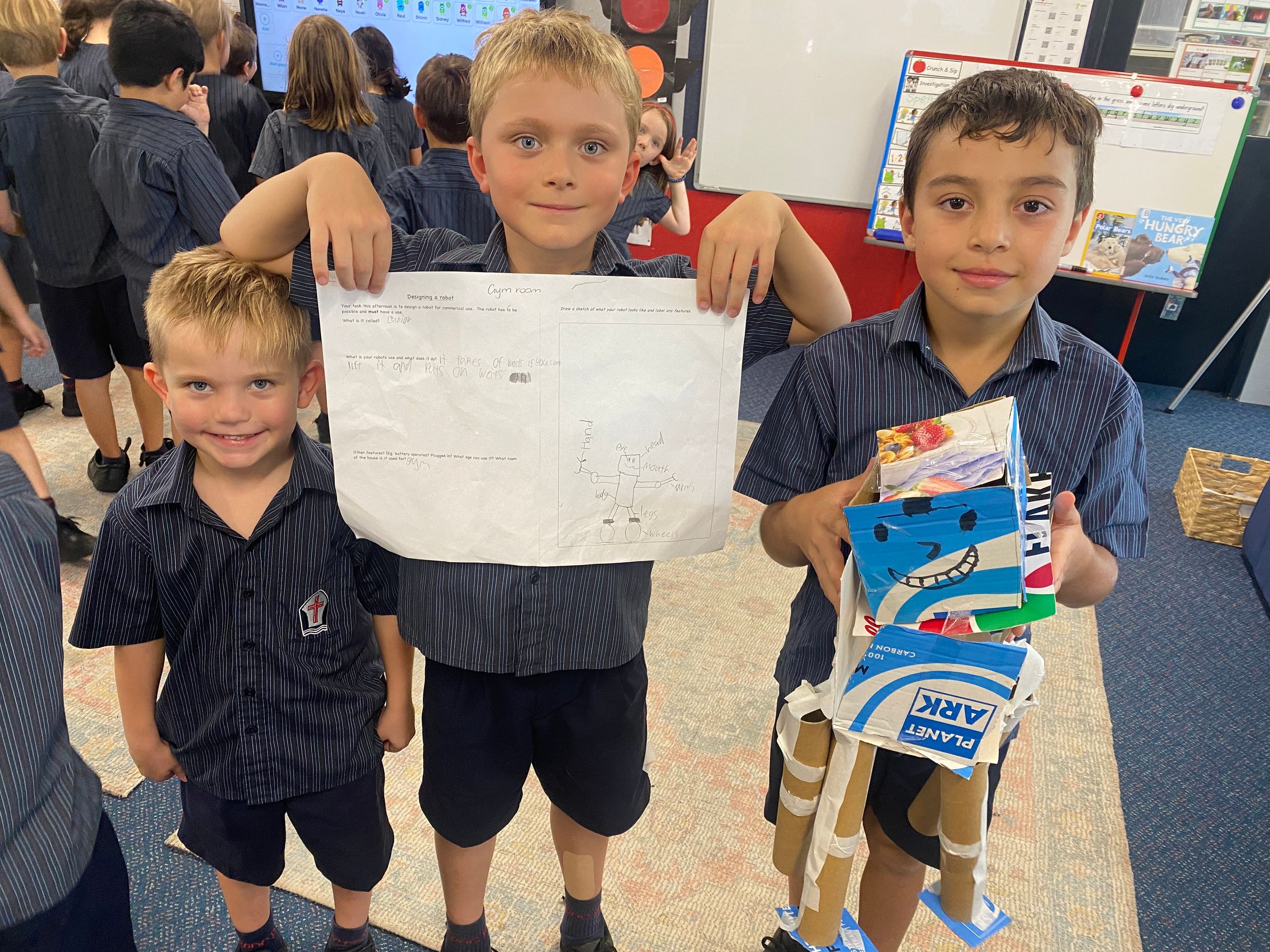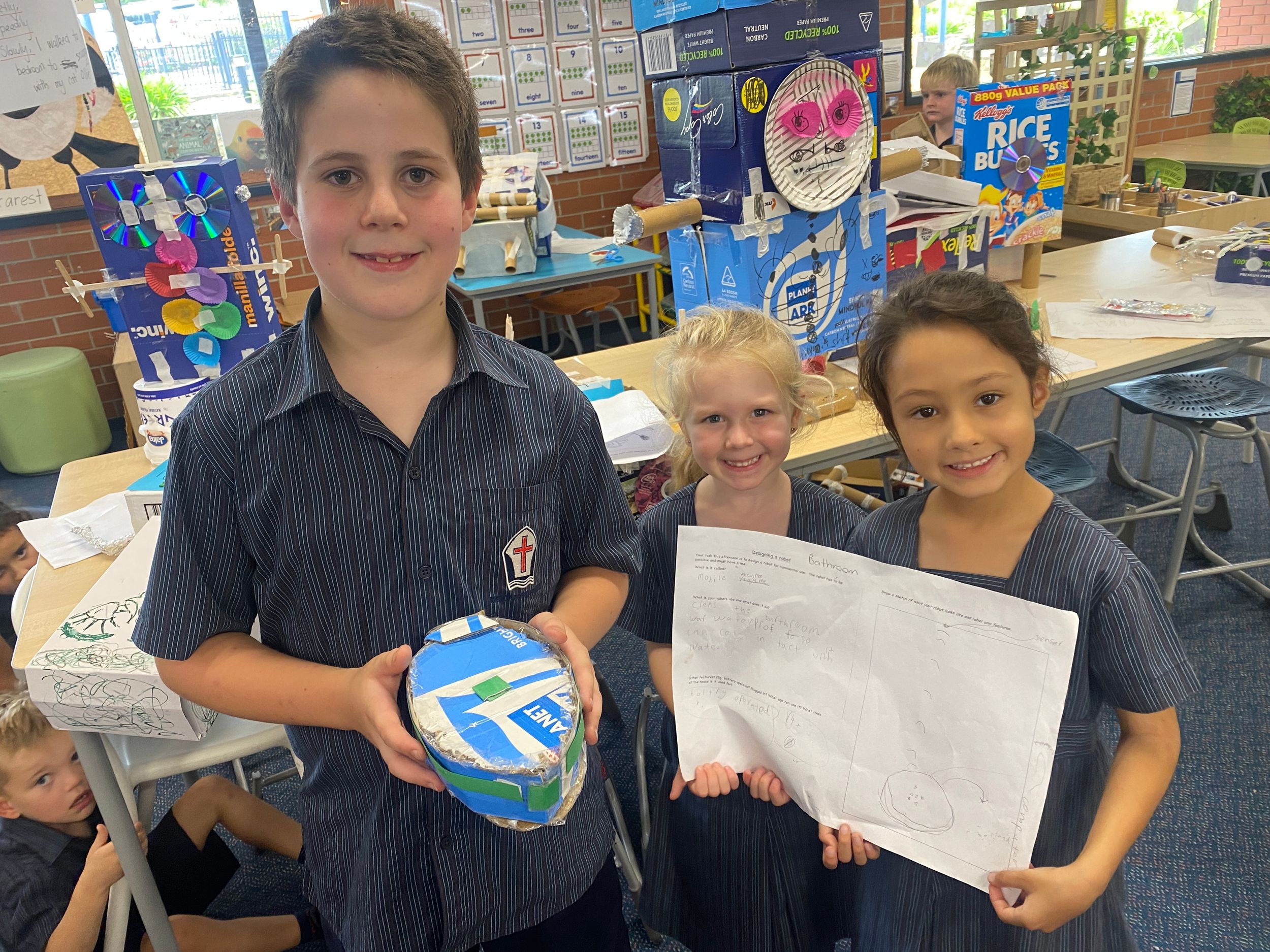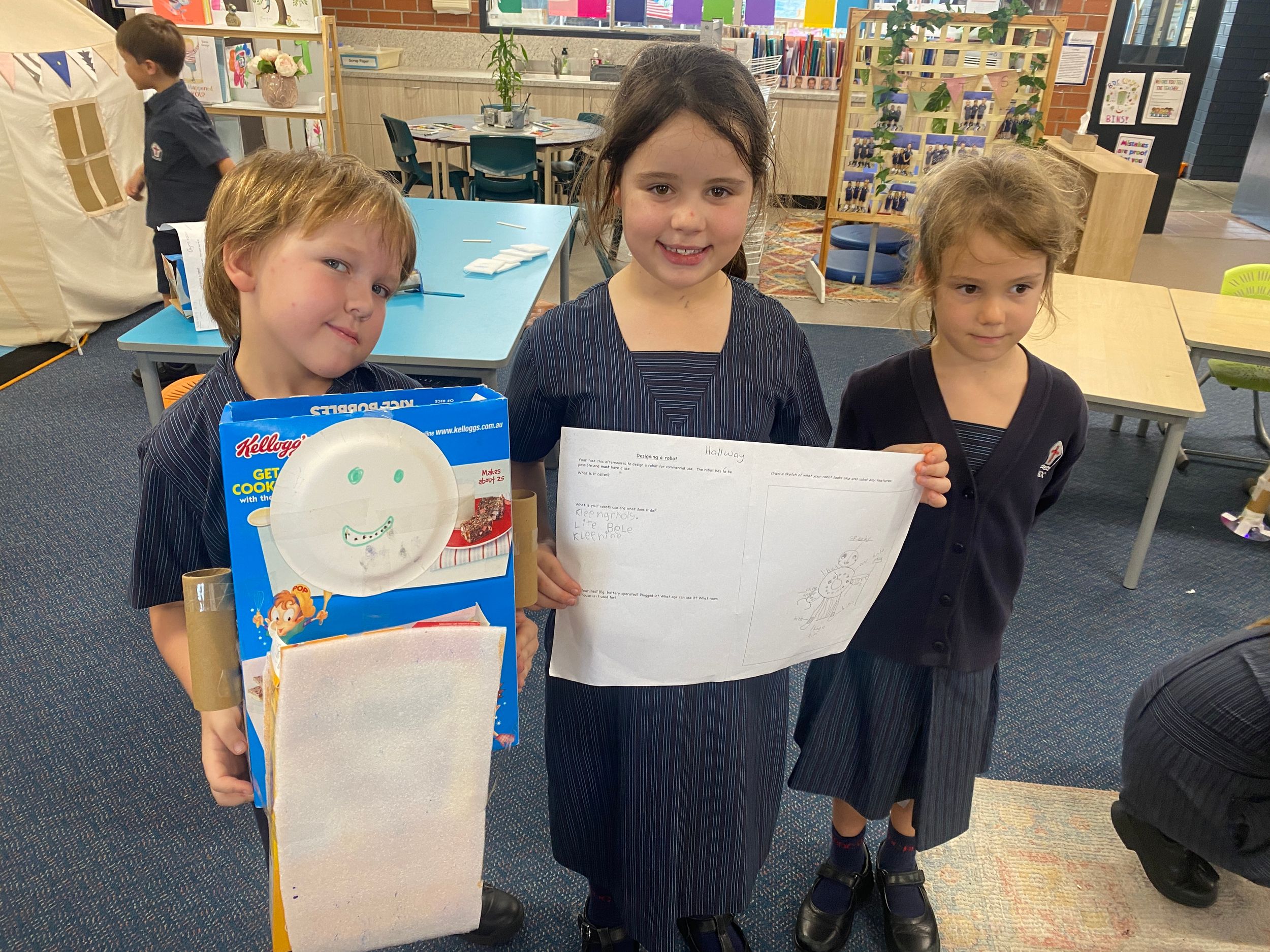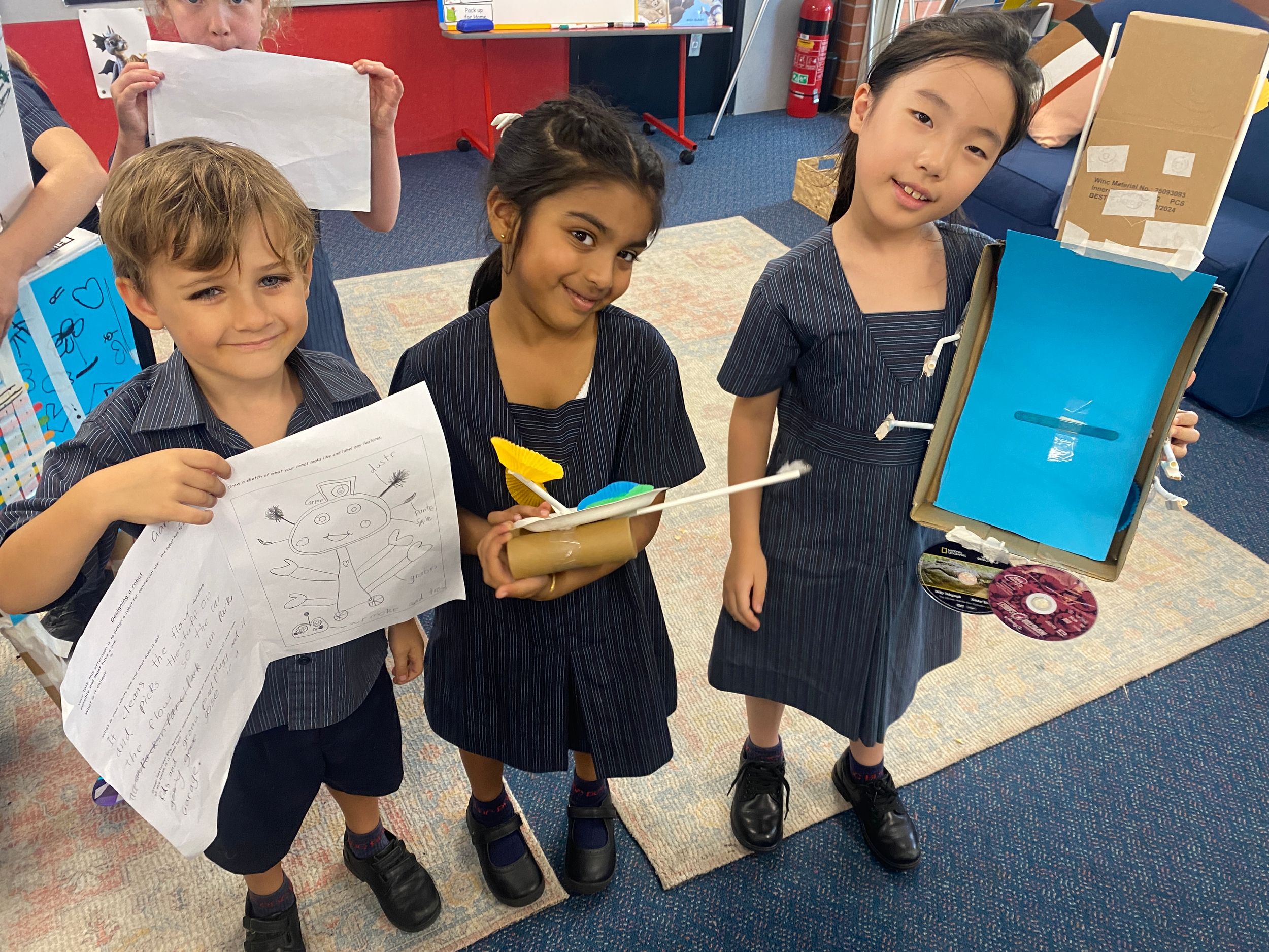 Thank you to Olivia’s mum, Mrs Miller who came to assist with the making phase. We also thank Mr Smith who enjoyed listening to our explanations of our robot designing and making and seeing our finished products.