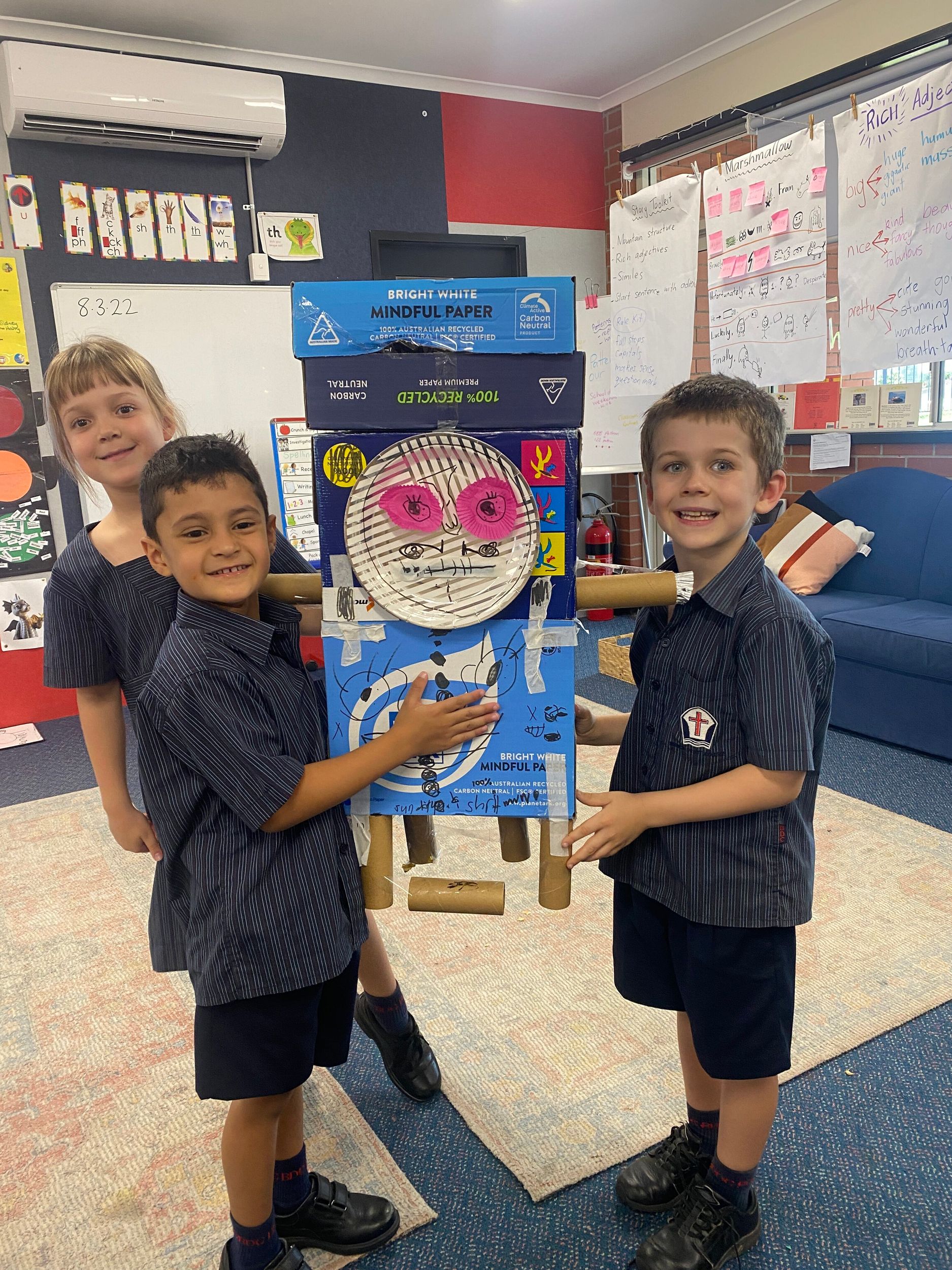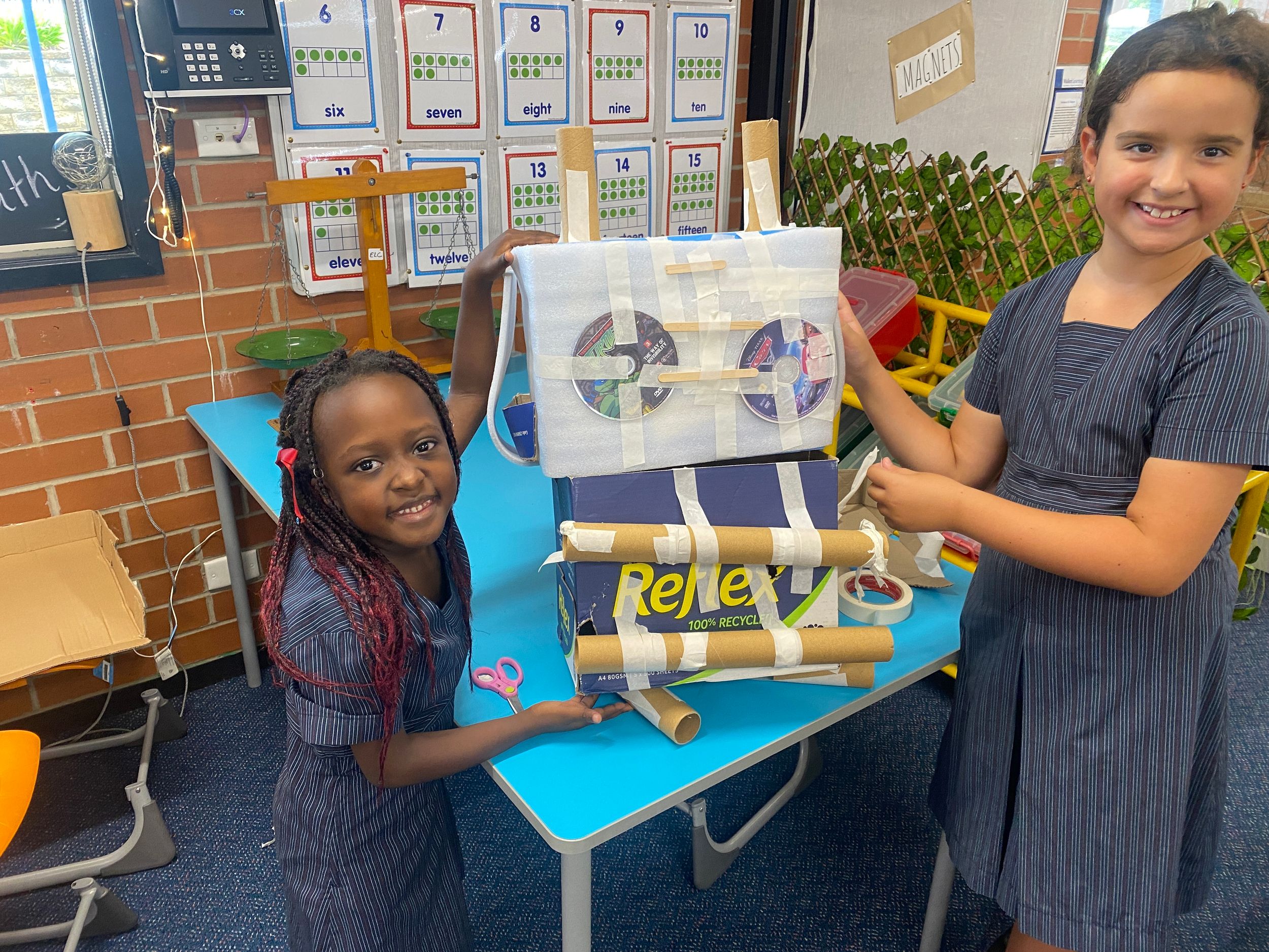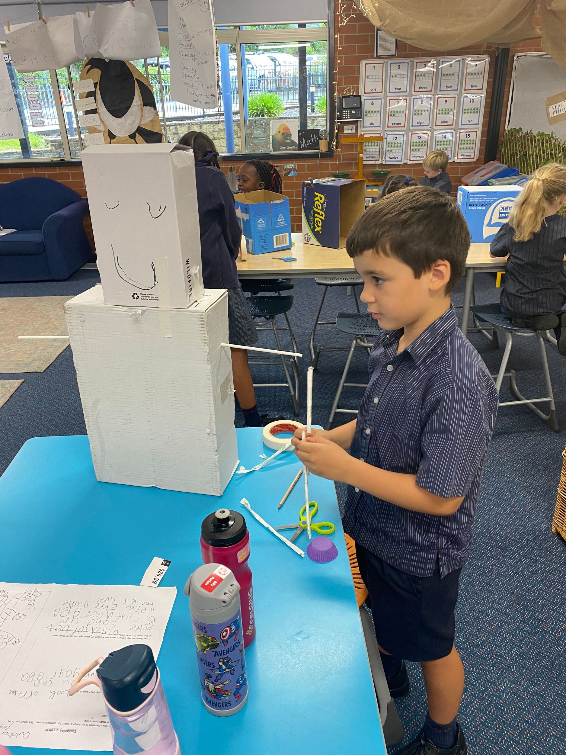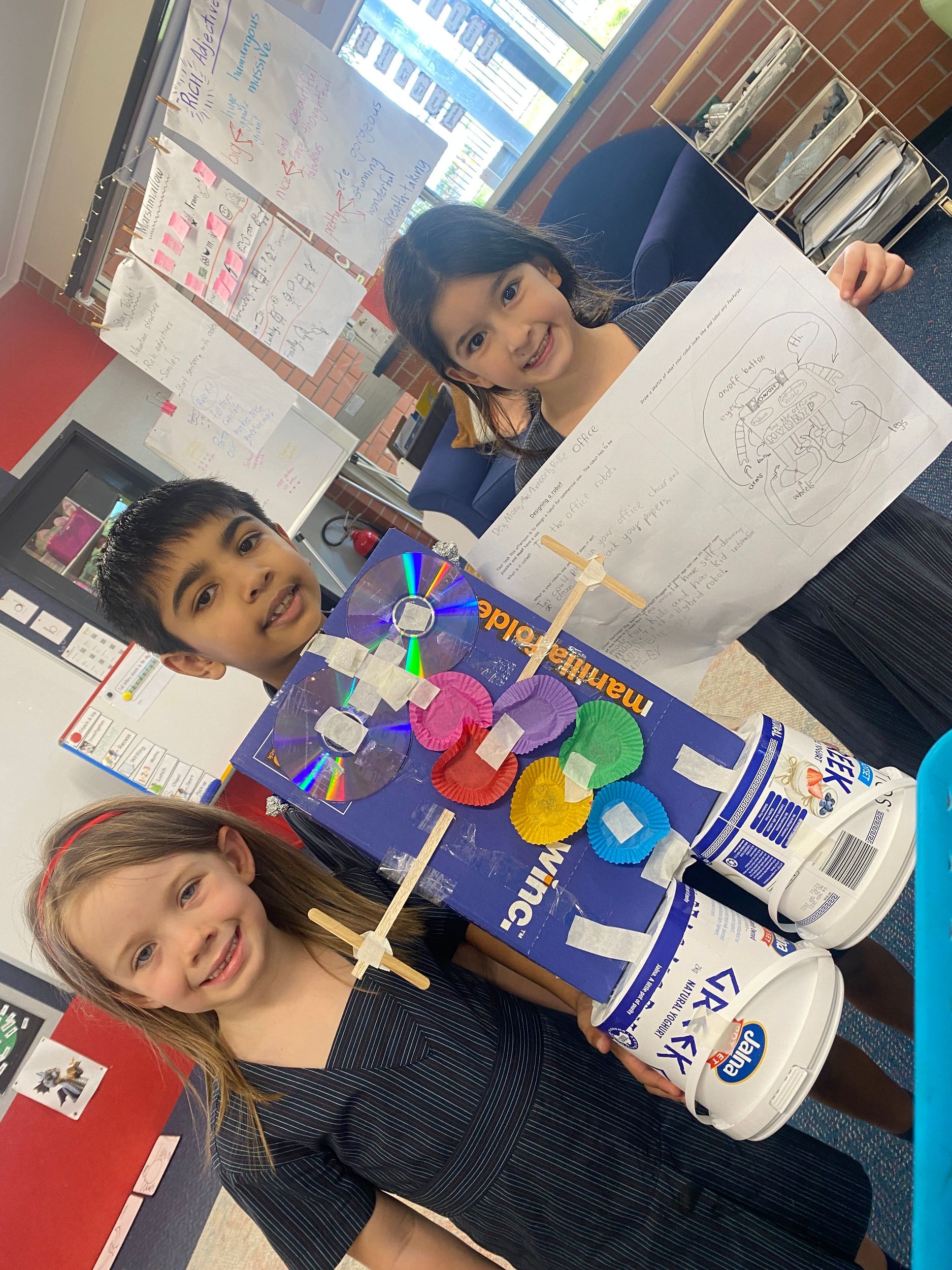 Thank you to Olivia’s mum, Mrs Miller who came to assist with the making phase. We also thank Mr Smith who enjoyed listening to our explanations of our robot designing and making and seeing our finished products.